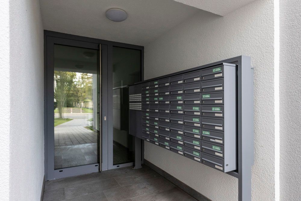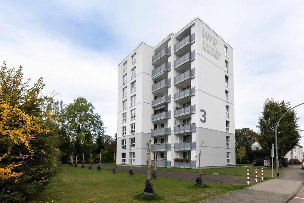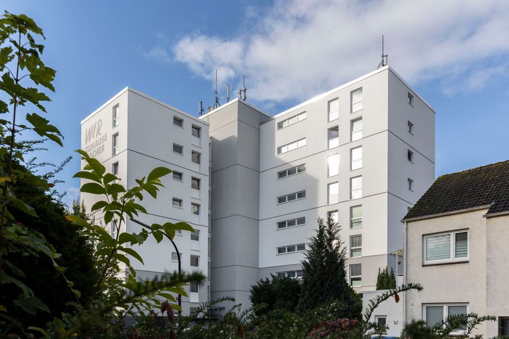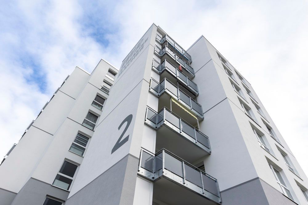 Weißes Gebäude mit Glaseingang und Schild „Jörg Hinrichs“.