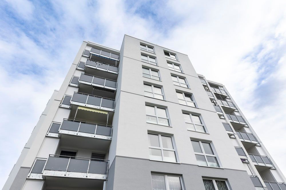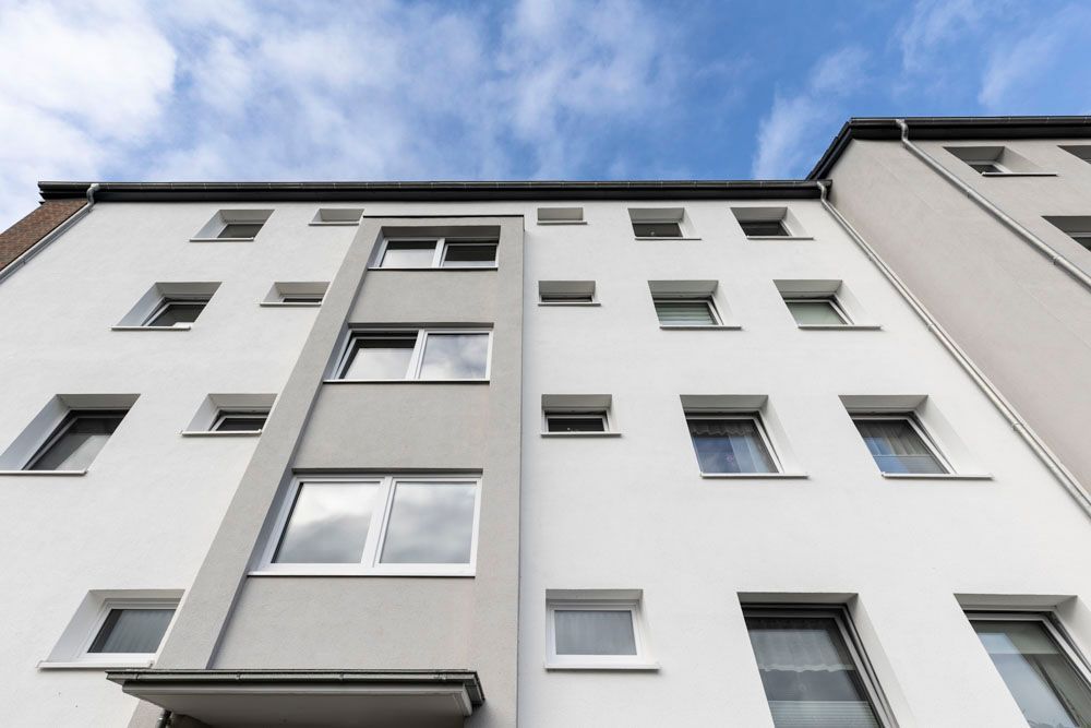 Blaues mehrstöckiges Gebäude mit schwarz gerahmten Fenstern und weißen Verzierungen vor blauem Himmel.